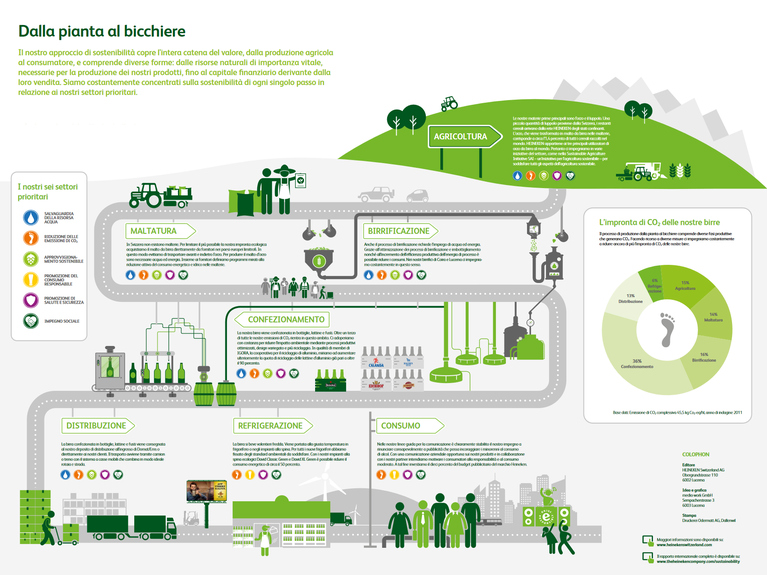 Le nostre materie prime principali sono l’orzo e il luppolo. Una piccola quantità di luppolo proviene dalla Svizzera, i restanti cereali arrivano dalla rete HEINEKEN degli stati confinanti. L’orzo, che viene trasformato in malto da birra nelle malterie, corrisponde a circa l’1,4 percento di tutti i cereali raccolti nel mondo. HEINEKEN appartiene ai tre principali utilizzatori di orzo da birra al mondo. Pertanto ci impegniamo in varie iniziative del settore, come nella Sustainable Agriculture Initiative SAI – un’iniziativa per l’agricoltura sostenibile – per soddisfare tutti gli aspetti dell’agricoltura sostenibile.
